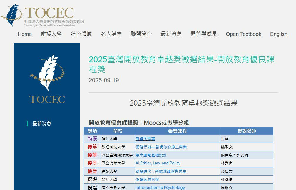 2024年由臨床心理學系劉同雪、林慧麗、李宛霖三位教師共同開設的《心靈不簡單》,榮獲「臺灣開放教育卓越獎」中「開放教育優良課程獎–MOOCs組優等獎」;今年由醫學系王霈老師開設之《身體不思議》,課程全由老師親自手繪製作頗具特色,也受審查委員肯定,榮獲「開放教育優良課程獎–MOOCs組特優獎」,展現輔大在數位教學創新上的厚實能量。