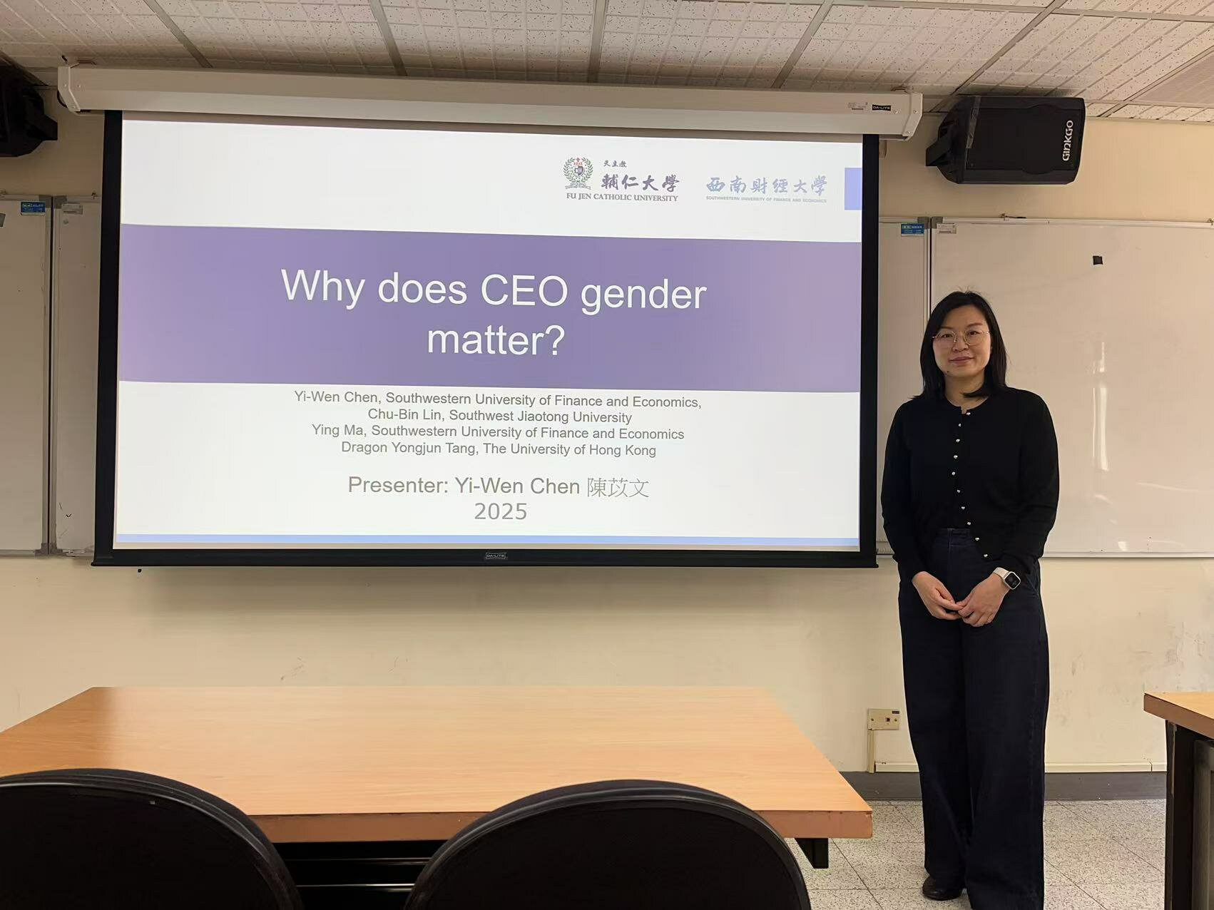 2025年1月21日,輔仁大學資訊管理系與國際處聯合舉辦了一場國際學術交流活動,特邀西南財經大學金融學院陳苡文教授蒞臨本校,於羅耀拉大樓SL201教室進行學術專題演講。本次交流活動由黃曜輝教授主持,旨在促進兩岸學術合作。