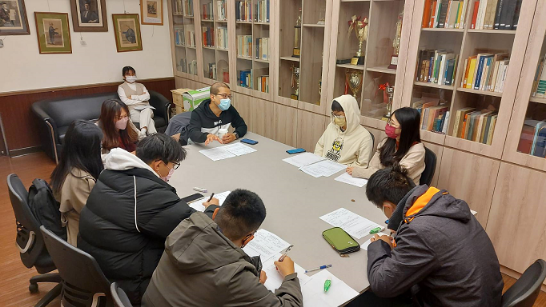 普法服務—研究生帶領法律服務隊同學與民眾面談,進行事實整理與初步答覆,再進入律師休息室進行專業討論,獲得指導後由同學回覆民眾