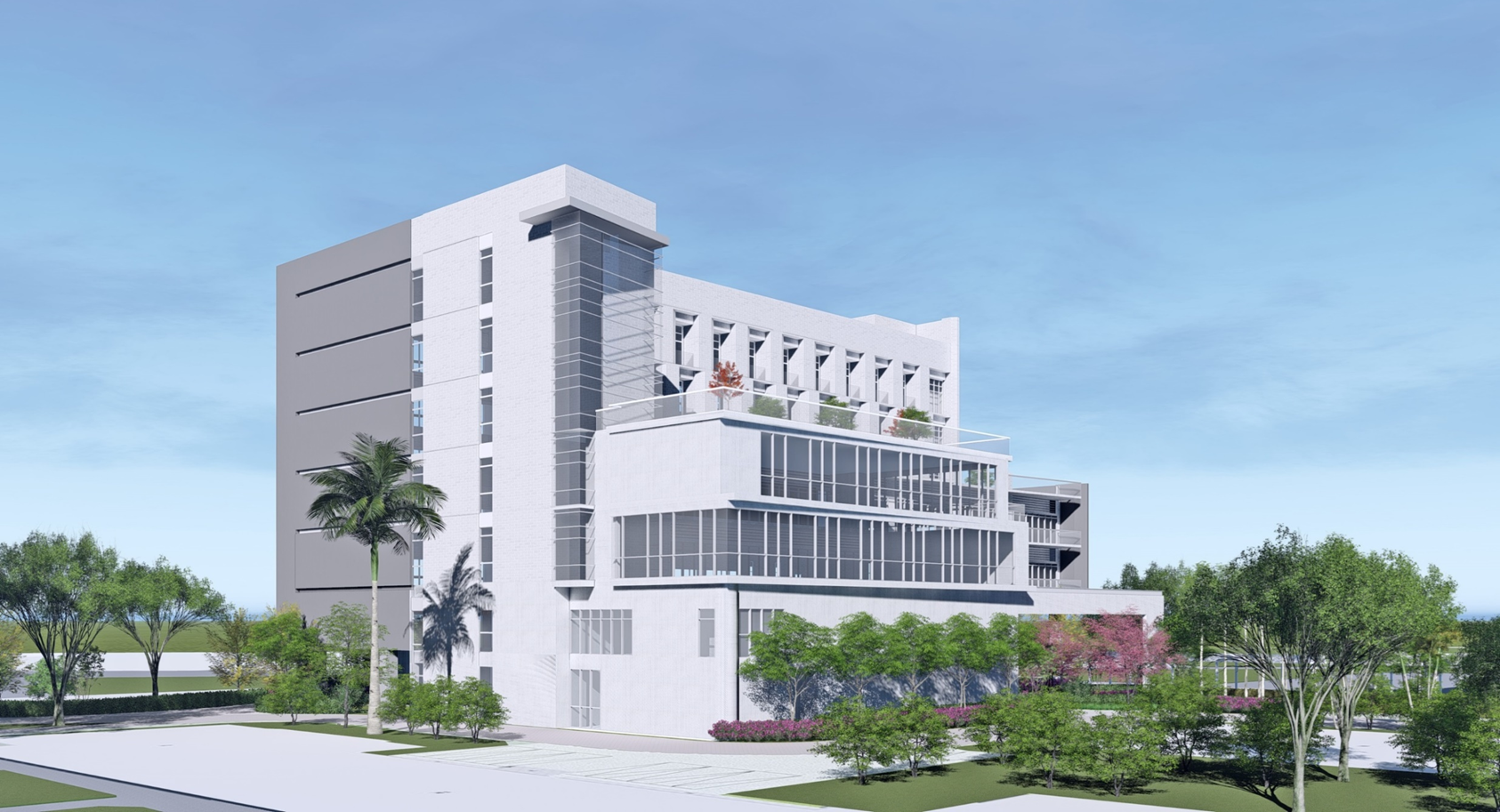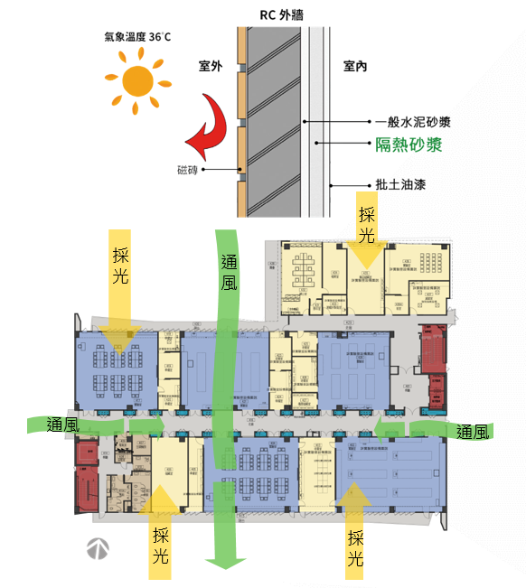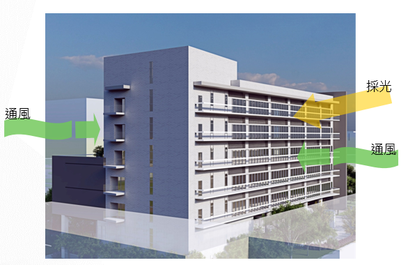 建築物平面規劃採南北配置,CORE安排於中央走廊東西二端,走廊兩端設置陽台及對外開窗,使走廊有通風採光,南北向立面採大面積開窗及長條陽台,大大增加了實驗教室之採光與通風。