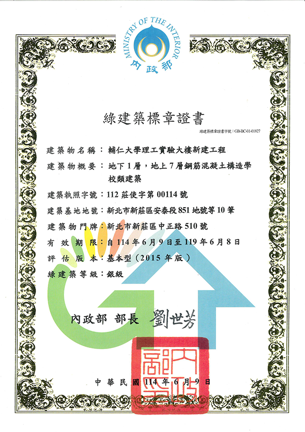 輔仁大學理工新實驗大樓於114年6月9日榮獲銀級綠建築標章,這不僅是對其建築設計和環保理念的肯定,也彰顯了輔大在永續發展上的努力與承諾。這座嶄新的實驗大樓在色彩搭配上延續了校園既有的建築色系,並大膽採用了新穎、更耐用的建材,不僅提升了整體質感,也讓日常維護變得更加容易。灰白色系的瓷磚、金屬鋁板以及清水混凝土的運用,以現代建築語彙勾勒出理工學院簡潔卻富有科技感的意象。