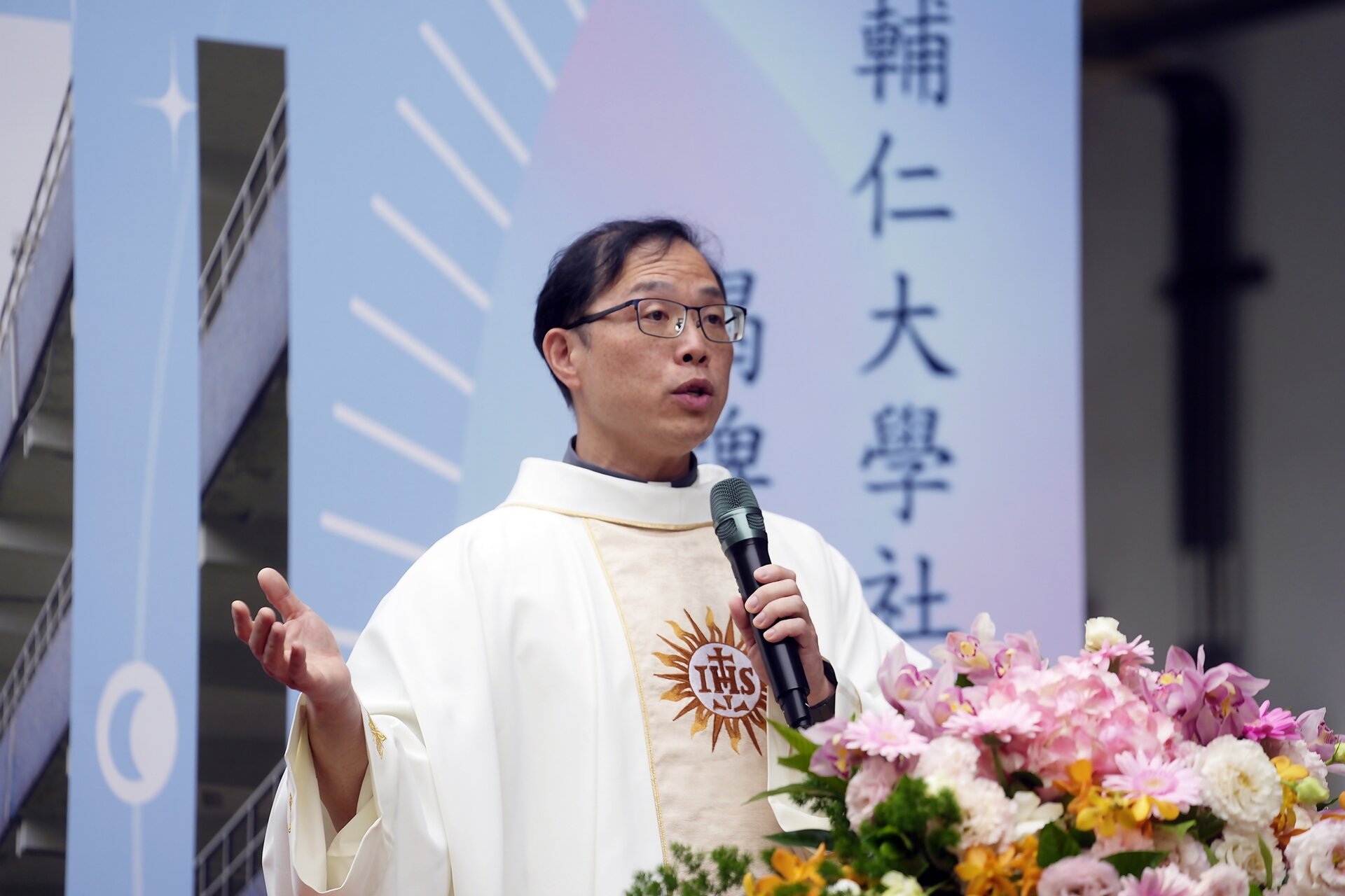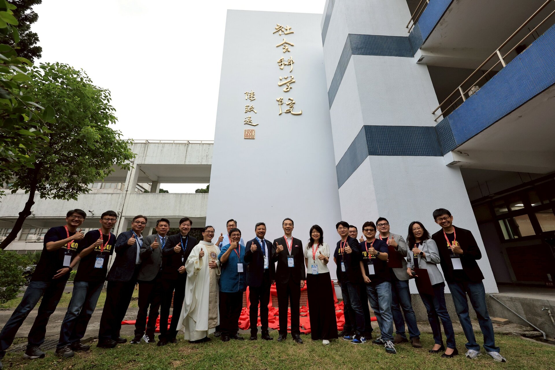 典禮於上午10時揭開序幕,在耶穌會使命室主任馮漢中神父莊嚴祝禱下,由陳致遠學長、校長藍易振、使命副校長汪文麟、學術副校長王英洲、行政副校長賴振南、資源與事業發展副校長兼社科院院長彭正浩、輔大全球校友會鄭時寧總會長、校牧何萬福神父、耶穌會代表洪萬六神父,以及社科院三位副院長吳宗昇、劉一龍、黃揚名老師,與四系所主任巫麗雪、吳震台、張超然、陳文祥老師等17位長官共同揭幕,讓陳學長的墨寶首次在伯達樓牆面熠熠生輝,為典禮增添榮光。
