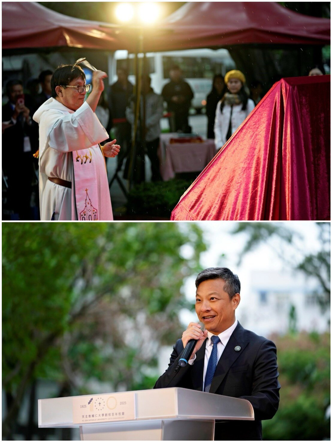 上圖:校牧為大樹紀念牌揭牌祈禱與灑水降福;下圖:校長致詞感謝所有樹木認養者