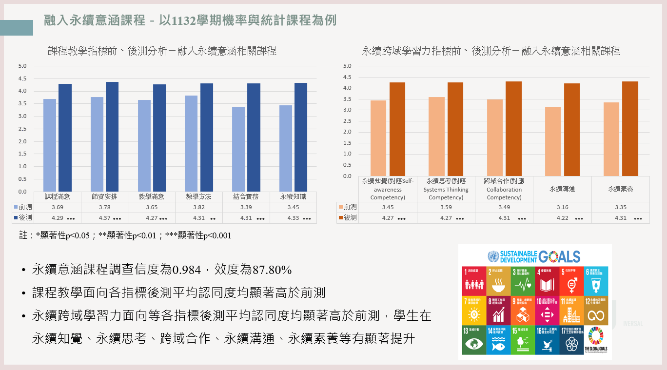 以機率與統計課程為例,課程融入永續議題後,學生學習成效與認同度顯著提升