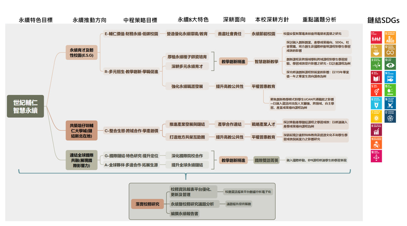 永續發展暨校務研究中心於 114 年度執行「永續發展下校務研究的整合:校務成效分析及校務資訊報表平台優化」計畫,結合教育部補助資源與校內獎補助計畫,全面檢視校務與深耕重點計畫執行成效,並對應 G.R.A.C.E 中程策略目標、高教深耕計畫面向及SDGs,展現校園永續治理與教育創新成果。