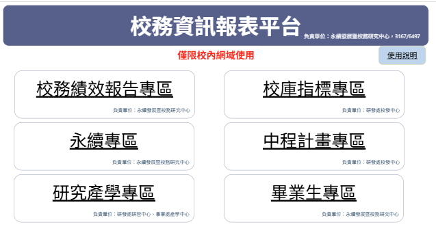 持續蒐集校內外校務量化數據,採用 Power BI 呈現校務指標分析報表,並提供全校單位帳號申請。校務績效報表平台6大專區整合校務績效報告、中程計畫、永續指標、畢業生流向、產學研究等數據,截至 114 年 12 月 9 日累計使用人次達 36,536,顯示教學與行政單位使用情形顯著提升。