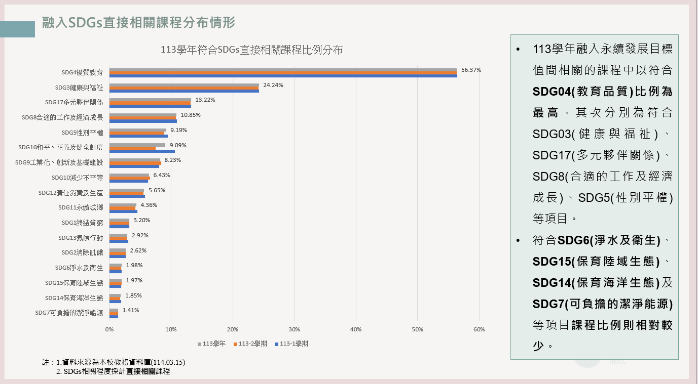課程融入 SDGs 的比例分布,SDG4(優質教育)與 SDG12(責任消費與生產)占比最高,反映校園課程設計與永續目標緊密結