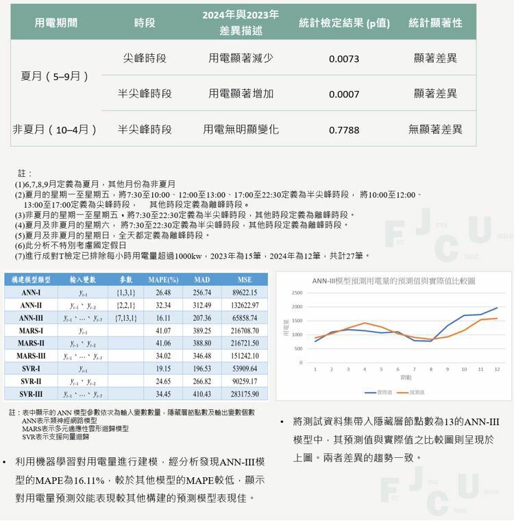 - 低碳校園研究:以秉雅樓為例,安裝智慧電表後,2024 年夏月尖峰用電量較 2023 年顯著下降,並透過機器學習模型(ANN-III)預測能耗趨勢,效能最佳,預測結果與實際值一致。