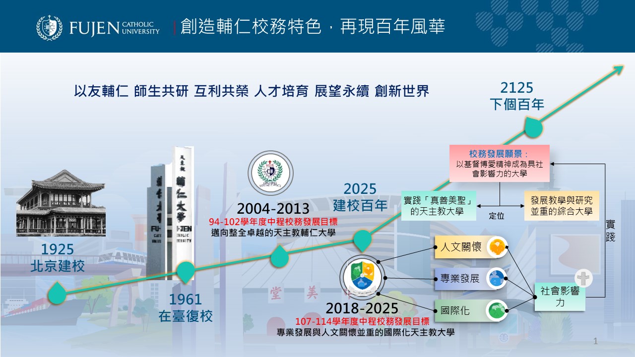 天主教輔仁大學於1925年由美國本篤會於北京創校,1961年在台復校,復校迄今,秉持天主教敬天愛人的使命和真善美聖的校訓下,致力培育為社會所用的人才。民國109年因疫情導致全球產業鏈面臨巨大轉變,輔仁大學面對變革可能帶來的衝擊,校長於109年4月策略會議,責請學術副校長啟動111-114學年度中程計畫擬定,期盼從盤點現況、考量國內外趨勢,以永續的觀點擘畫在面對後疫情時代的關鍵5年,持續保有輔仁關鍵優勢。