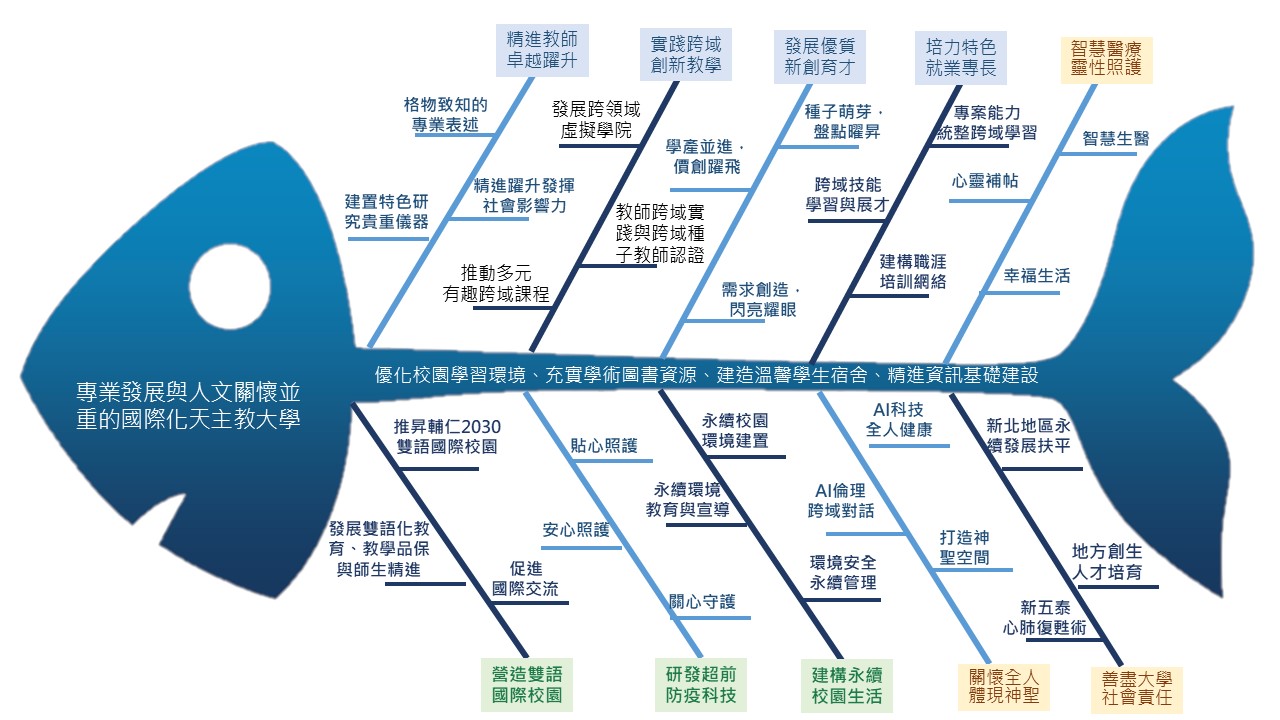 在基督博愛精神及111-114學年度中程校務發展總目標—「專業發展與人文關懷並重的國際化天主教大學」之引領,本校將歷年來校務發展各類辦學成果及國際趨勢、國家政策、高校產業發展政策等進行資源分析後,開展固本、創新兼具多元領域知識之10+亮點目標策略,即10項特色亮點策略、4項前瞻基礎建設策略,合計14項亮點目標策略。