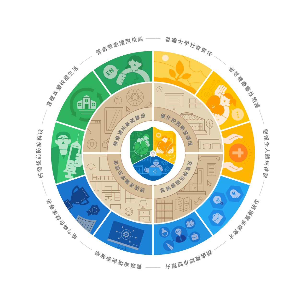 10+亮點目標策略整合附設醫院、各學院專業及全球校友會及姊妹校的優勢,帶動學校教學創新,培育具前瞻、創新、包容與人文之跨域全人人才。配合國家整體科研發展,結合教師科研能量帶動產業研發與深耕在地創生,提升產業競爭及創建和平包容永續的社會,融滲天主教人文關懷精神。